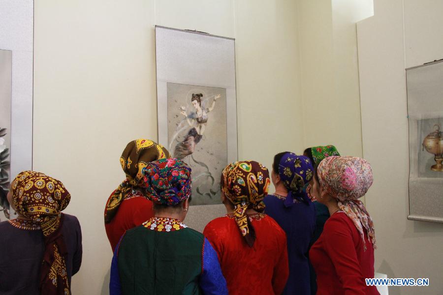 Visitors watch an art piece of Suxiu embroidery during an exhibition at a museum in Ashkhabad, capital of Turkmenistan, Sept. 28, 2013. As a part of the events held during the "Chinese Culture Day", the exhibition displays nearly 40 pieces of artworks of Suxiu, one of the four major Chinese embroidery styles. (Xinhua/Lu Jingli)
