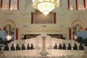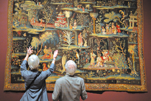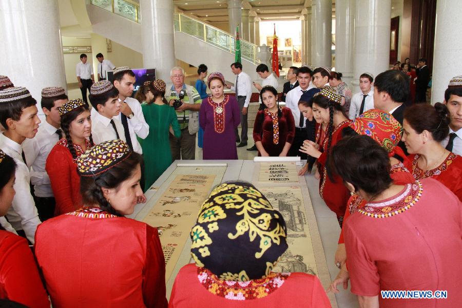 Visitors watch an art piece of Suxiu embroidery during an exhibition at a museum in Ashkhabad, capital of Turkmenistan, Sept. 28, 2013. As a part of the events held during the "Chinese Culture Day", the exhibition displays nearly 40 pieces of artworks of Suxiu, one of the four major Chinese embroidery styles. (Xinhua/Lu Jingli)