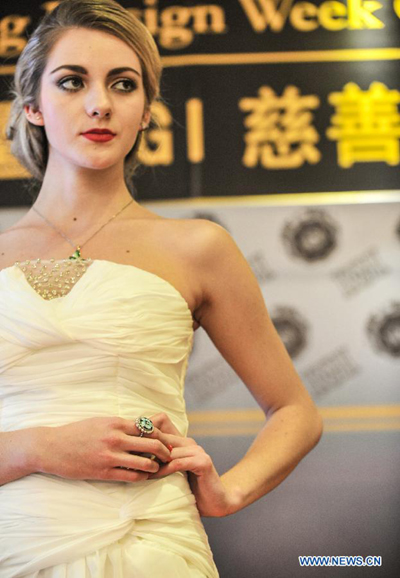 A model shows jewelry during the charity auction of the 2013 Beijing Design Week in Beijing, capital of China, Sept 28, 2013. A total of over 500,000 yuan (about 81,700 U.S. dollars) earned through the auction will be donated to the Beijing Gaozhanxiang Culture and Arts Foundation. (Xinhua/Li He)
