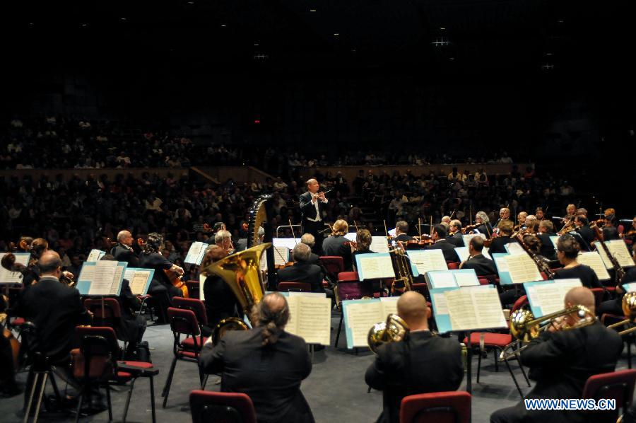 Chinese musician and orchestra maestro Xu Zhong conducts Haifa's Symphony Orchestra in Haifa, Israel, on Oct. 6, 2013. Chinese musician and orchestra maestro Xu Zhong took on the lead of Haifa's Symphony Orchestra for this year's season, in a bid to boost the Israeli city's musical scene and bring Israeli music to the international arena. The Shangai-based musician will spend a year in the coastal city, while a joint musical venture between the two countries will establish an international orchestra composed of 30 Chinese and 30 Israeli musicians chosen by Zhong himself, to play around the world. Zhong's first Haifa concert in Haifa on October 6 wowed the Israeli public with classical performances alongside the city's symphonic orchestra. [Xinhua/Li Rui]