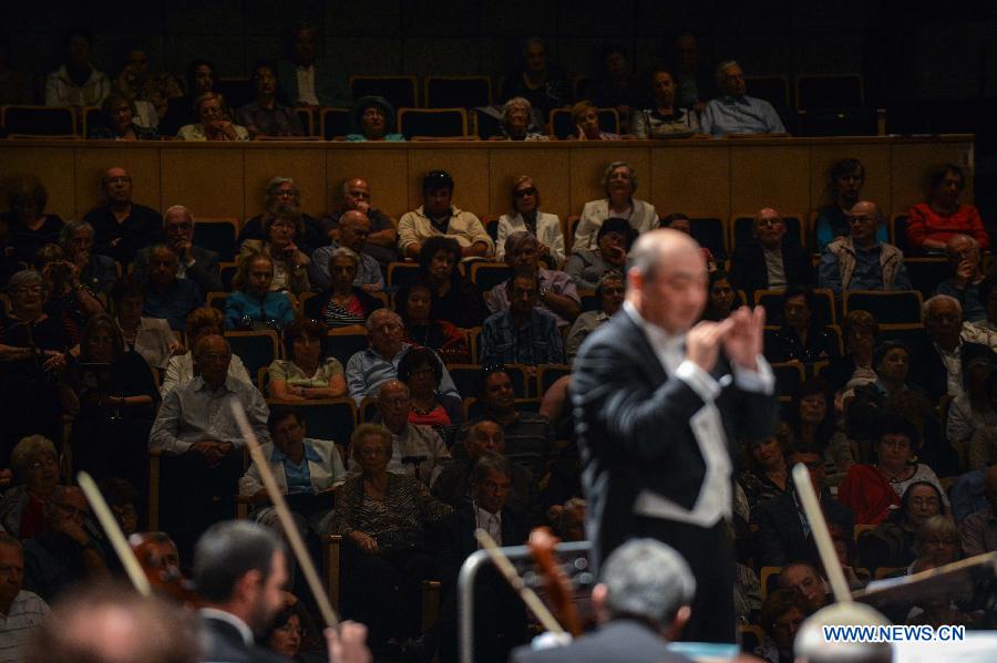 Audience enjoy the concert presented by Chinese musician and orchestra maestro Xu Zhong and Haifa's Symphony Orchestra in Haifa, Israel, on Oct. 6, 2013. Chinese musician and orchestra maestro Xu Zhong took on the lead of Haifa's Symphony Orchestra for this year's season, in a bid to boost the Israeli city's musical scene and bring Israeli music to the international arena. The Shangai-based musician will spend a year in the coastal city, while a joint musical venture between the two countries will establish an international orchestra composed of 30 Chinese and 30 Israeli musicians chosen by Zhong himself, to play around the world. Zhong's first Haifa concert in Haifa on October 6 wowed the Israeli public with classical performances alongside the city's symphonic orchestra. [Xinhua/Li Rui]