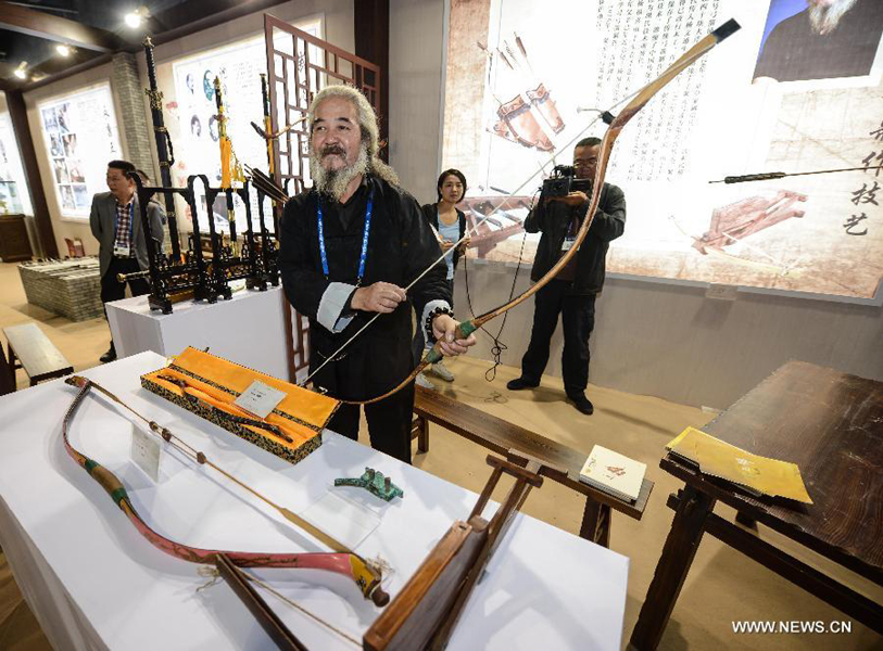 A crafter presents a bow at the First China Hangzhou Asia-Pacific Craft Fair in Hangzhou, capital of east China's Zhejiang Province, Oct. 18, 2013. The craft fair kicked off on Oct. 17, attracting 661 skilled crafters from home and other Asia-Pacific countries.(Xinhua/Xu Yu)