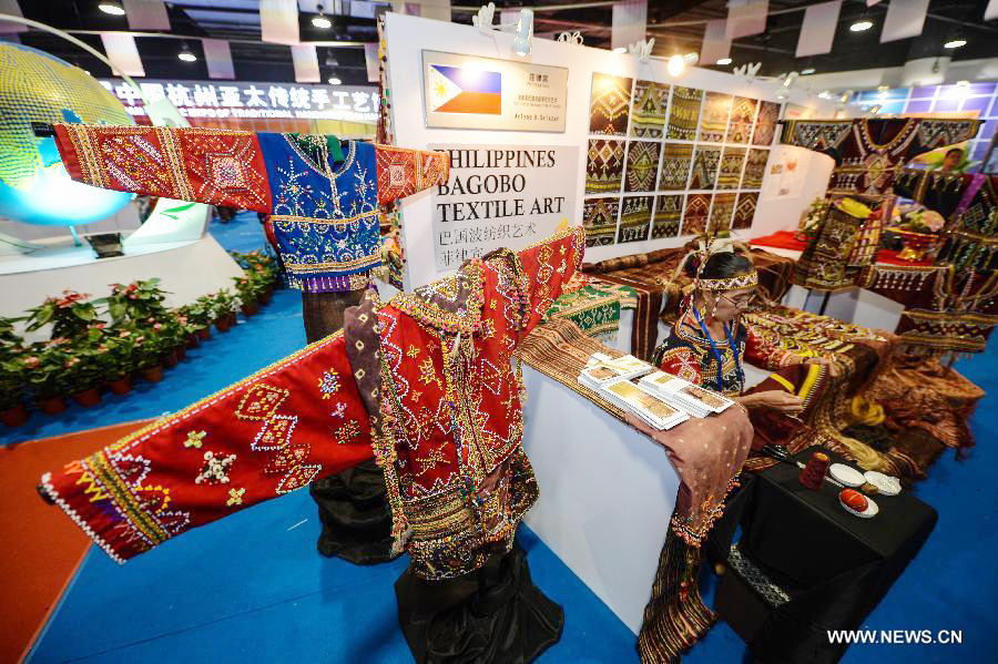A Philippine crafter presents folk textile skill at the First China Hangzhou Asia-Pacific Craft Fair in Hangzhou, capital of east China's Zhejiang Province, Oct. 18, 2013. The craft fair kicked off on Oct. 17, attracting 661 skilled crafters from home and the Asia-Pacific countries.(Xinhua/Xu Yu)