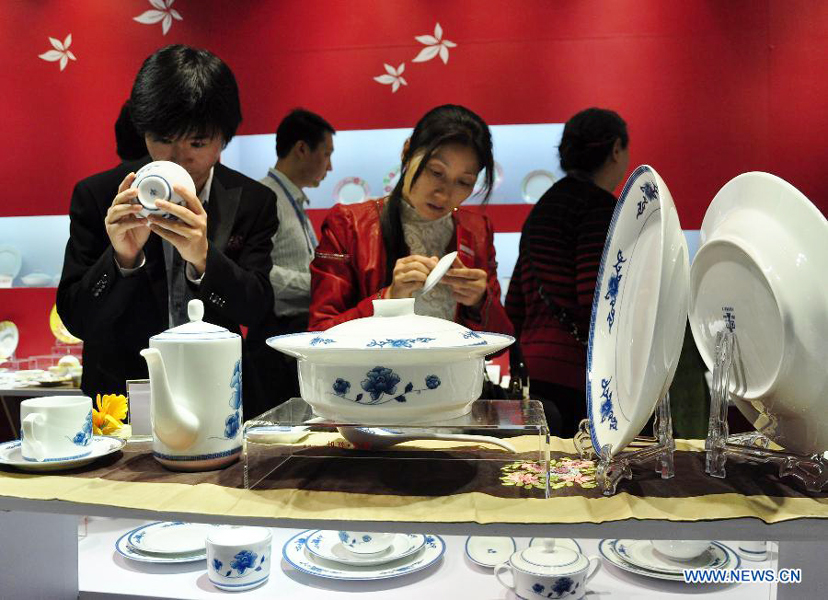 Visitors view ceramic articles of everyday use during the 2013 China Jingdezhen International Ceramic Fair in Jingdezhen City, east China's Jiangxi Province, Oct. 18, 2013. Over 800 exhibiters took part in the fair which kicked off here on Friday. (Xinhua/Hu Dunhuang)