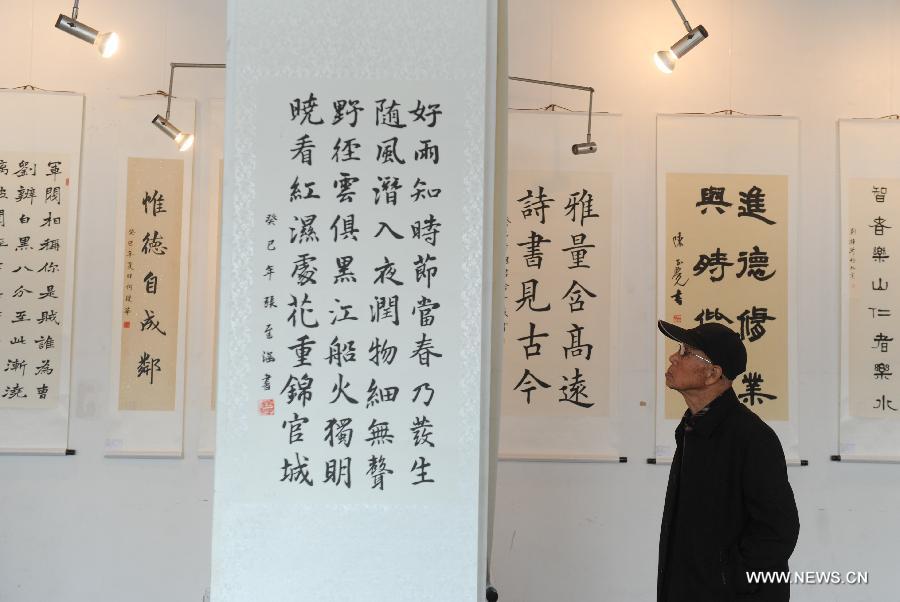 A man looks at a calligraphic work at Beijing Working People's Culture Palace, Beijing, capital of China, Oct. 27, 2013. Hundreds of winning calligraphic works of students, who are from Beijing's primary and middle schools, were displayed here on Sunday after a contest concluded. (Xinhua/Luo Xiaoguang) |