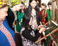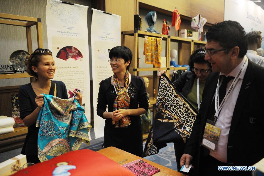 Guests look around at the Chinese Silk Exhibition during the International Silkroad Congress in Istanbul, Turkey, Oct. 28, 2013. International Silkroad Congress was held in Istanbul on Monday with the topic "Rethinking the region of peace, collaboration and trade between the east and west". Chinese silk exhibition was also held during the congress. (Xinhua/Lu Zhe)