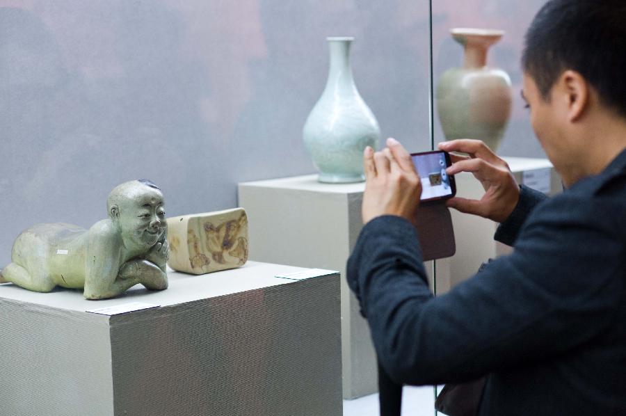 A visitor takes photos of cultural relics during a cultural relics preservation exhibition of the Three Gorges in the Chongqing China Three Gorges Museum in Chongqing, southwest China, Oct. 29, 2013. (Xinhua/Liu Chan)
