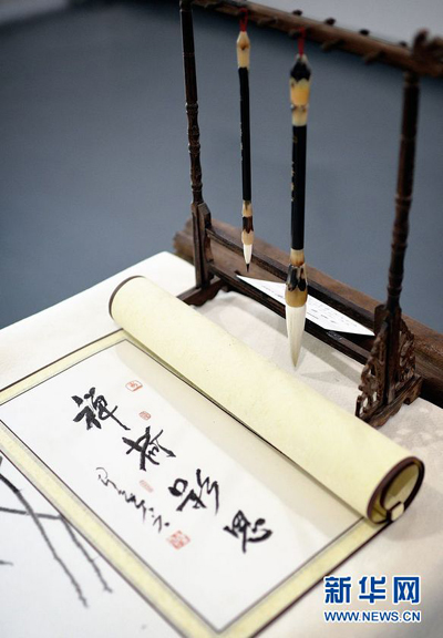Photo taken on Oct. 26, 2013 shows Suzhou embroidery "Jinqiuliuxiang" by Liang Xuefang and Yishui, and writing brush "Yibichanxin" by Huang Xiaohua at the Lotus Meditation Inter-disciplinary Arts Appreciation event. Masterminded by U.S. artist Elyse Ribbons and Chinese artist Yishui, the event featured inter-disciplinary art works, artistic video clip, aromatic art, Chinese Zither performance, creative dance, wine and tea tasting, attracting over 100 members of the culturati, press and enterprises to extend their "five senses" to be part of it. (Xinhua/Wang Chuandong)