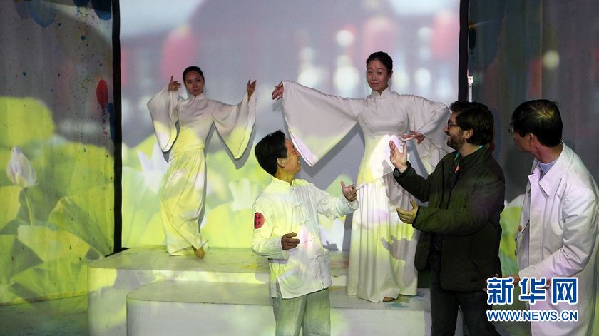 Photo taken on Oct. 26, 2013 shows performers presenting a creative dance at the Lotus Meditation Inter-disciplinary Arts Appreciation event. Masterminded by U.S. artist Elyse Ribbons and Chinese artist Yishui, the event featured inter-disciplinary art works, artistic video clip, aromatic art, Chinese Zither performance, creative dance, wine and tea tasting, attracting over 100 members of the culturati, press and enterprises to extend their "five senses" to be part of it. (Xinhua/Wang Chuandong)