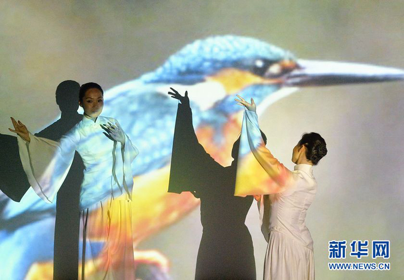 Photo taken on Oct. 26, 2013 shows performers presenting a creative dance at the Lotus Meditation Inter-disciplinary Arts Appreciation event. Masterminded by U.S. artist Elyse Ribbons and Chinese artist Yishui, the event featured inter-disciplinary art works, artistic video clip, aromatic art, Chinese Zither performance, creative dance, wine and tea tasting, attracting over 100 members of the culturati, press and enterprises to extend their "five senses" to be part of it. (Xinhua/Wang Chuandong)
