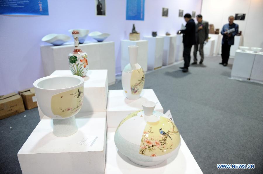 Visitors look at ceramic works displayed at the 16th West Lake Art Fair in Hangzhou, capital of east China's Zhejiang Province, Nov. 7, 2013. The five-day fair kicked off Thursday at Hangzhou Peace International Convention & Exhibition Center. (Xinhua/Ju Huanzong)