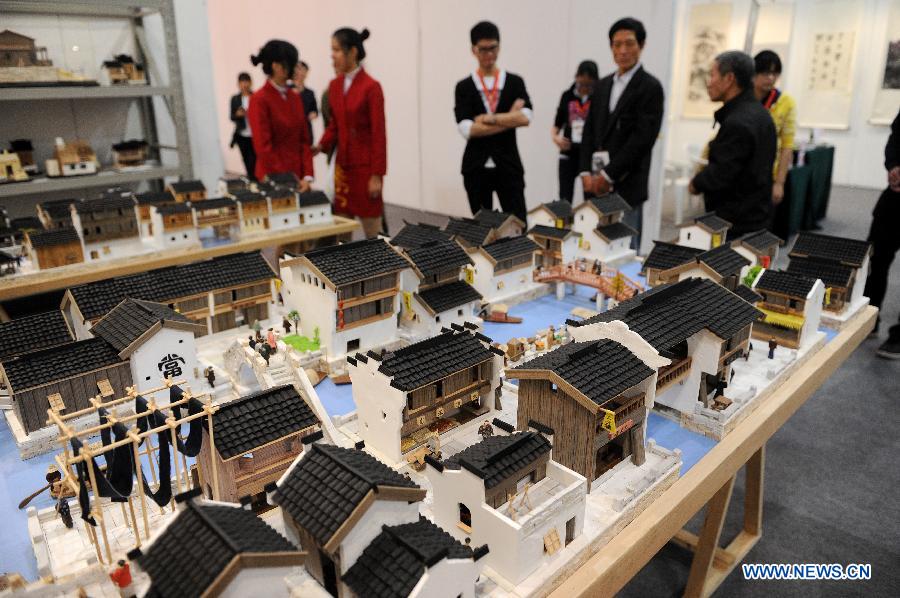 Visitors look at art models displayed at the 16th West Lake Art Fair in Hangzhou, capital of east China's Zhejiang Province, Nov. 7, 2013. The five-day fair kicked off Thursday at Hangzhou Peace International Convention & Exhibition Center. (Xinhua/Ju Huanzong)