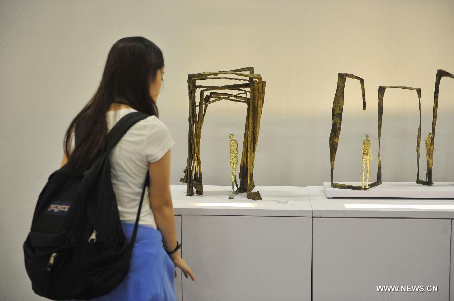 A visitor looks at an artwork during Art Taipei 2013, Taipei, southeast China's Taiwan, Nov. 8, 2013. Art Taipei 2013, the longest-running art fair in Asia, was open to public here on Friday, presenting over 3000 artworks of more than 500 artists from 14 countries and regions. (Xinhua/Lu Peng)
