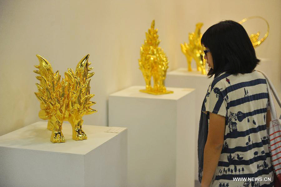 A visitor looks at an artwork during Art Taipei 2013, Taipei, southeast China's Taiwan, Nov. 8, 2013. Art Taipei 2013, the longest-running art fair in Asia, was open to public here on Friday, presenting over 3000 artworks of more than 500 artists from 14 countries and regions. (Xinhua/Lu Peng)