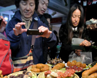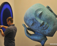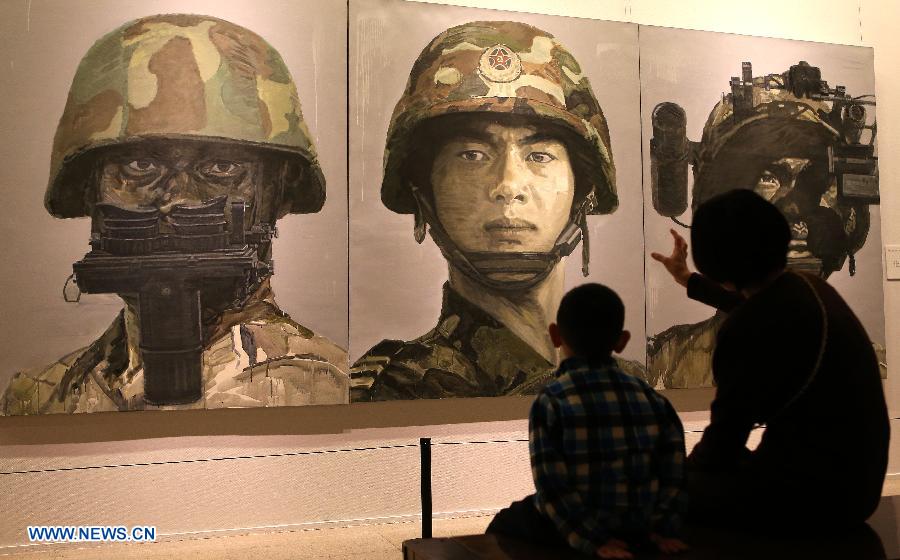 A woman and her son look at a set of oil painting displayed at the National Art Museum of China in Beijing, Nov. 8, 2013. An exhibition named "Shanghai Art Exhibition in Beijing" kicked off here Friday. The 12-day exhibition is the first collective show of Shanghai artists in Beijing since the National Flower-Bird Painting Exhibition in 1962. (Xinhua/Zheng Wei)