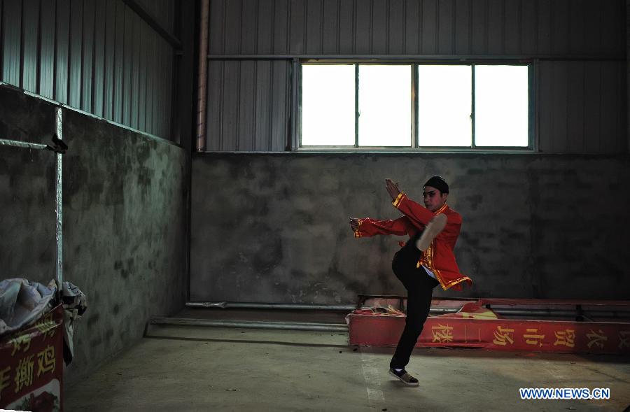 An actor of the Taojiang County Huagu Opera Troupe prepares for the performance at Zuojialun Village of Yingfengqiao Town in Yiyang City, central China's Hunan Province, Nov. 11, 2013. Being part of the activities of the 1st China Hunan Huagu Cultural Festival, several Huagu Opera troupes will go on a performing tour to 88 towns and villages in Yiyang. (Xinhua/Cheng Tingting)