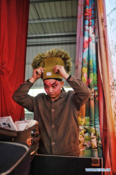 An actor of the Taojiang County Huagu Opera Troupe prepares for the performance at Zuojialun Village of Yingfengqiao Town in Yiyang City, central China's Hunan Province, Nov. 11, 2013. Being part of the activities of the 1st China Hunan Huagu Cultural Festival, several Huagu Opera troupes will go on a performing tour to 88 towns and villages in Yiyang. (Xinhua/Cheng Tingting)