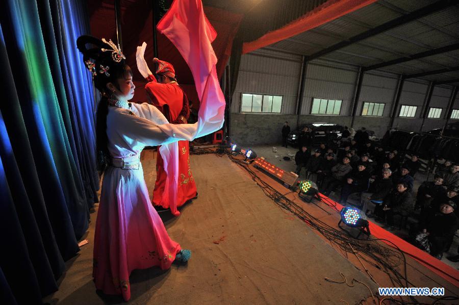 Members of the Taojiang County Huagu Opera Troupe perform at Zuojialun Village of Yingfengqiao Town in Yiyang City, central China's Hunan Province, Nov. 11, 2013. Being part of the activities of the 1st China Hunan Huagu Cultural Festival, several Huagu Opera troupes will go on a performing tour to 88 towns and villages in Yiyang. (Xinhua/Li Ga)