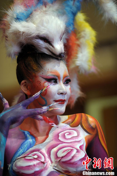 The body-painting performance named "China Myth" was held in Wuhan International Conference and Exhibition Center in Wuhan, central China’s Hubei province on Nov, 11, 2013. The show was organized by the 61th annual session of CIDESCO - world’s major international beauty therapy association, and more than 600 experts from 36 countries took part in the session.