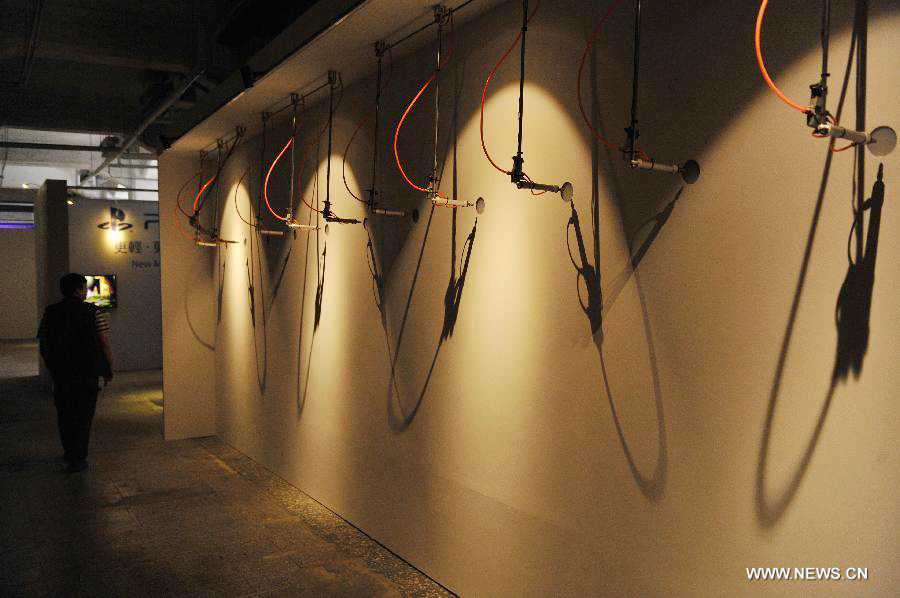 A journalist walks past a digital artwork at a press conference for the 2013 Taipei Digital Art Festival in Taipei, southeast China's Taiwan, Nov. 14, 2013. The festival will last from Nov. 15 to Nov. 24 at Songshan Cultural and Creative Park. (Xinhua/Lu Peng)