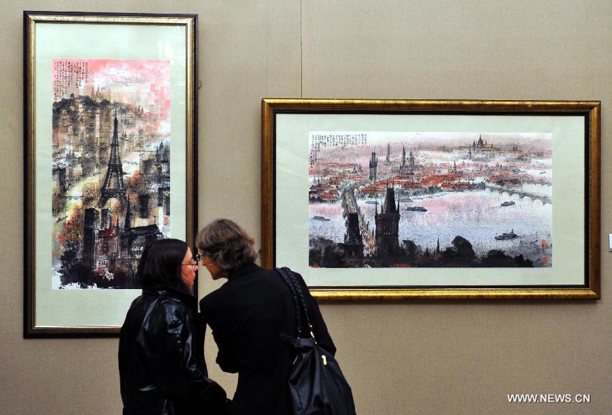People visit an exhibition of paintings by Jiang Mingxian, an artist of southeast China's Taiwan, in Paris, France, Nov. 14, 2013. An exhibition of Jiang Mingxian's paintings was held here on Thursday. (Xinhua/Chen Xiaowei)