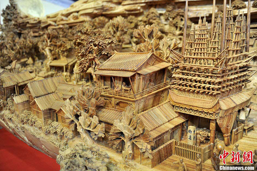A Chinese wooden carving created by Chinese artist Zheng Chunhui featuring the famous historical painting “Along the River During the Qingming Festival” was named the longest wooden carving in the world by Guinness World Book of Records on Nov. 14, 2013. Zheng spent four years on creating this sophisticated carving, which is 12.286 meters long, 3.075 meters high and 2.401 meters wide.(CNS/Lyu MIng)