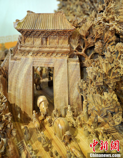 A Chinese wooden carving created by Chinese artist Zheng Chunhui featuring the famous historical painting “Along the River During the Qingming Festival” was named the longest wooden carving in the world by Guinness World Book of Records on Nov. 14, 2013. Zheng spent four years on creating this sophisticated carving, which is 12.286 meters long, 3.075 meters high and 2.401 meters wide.(CNS/Lyu MIng)