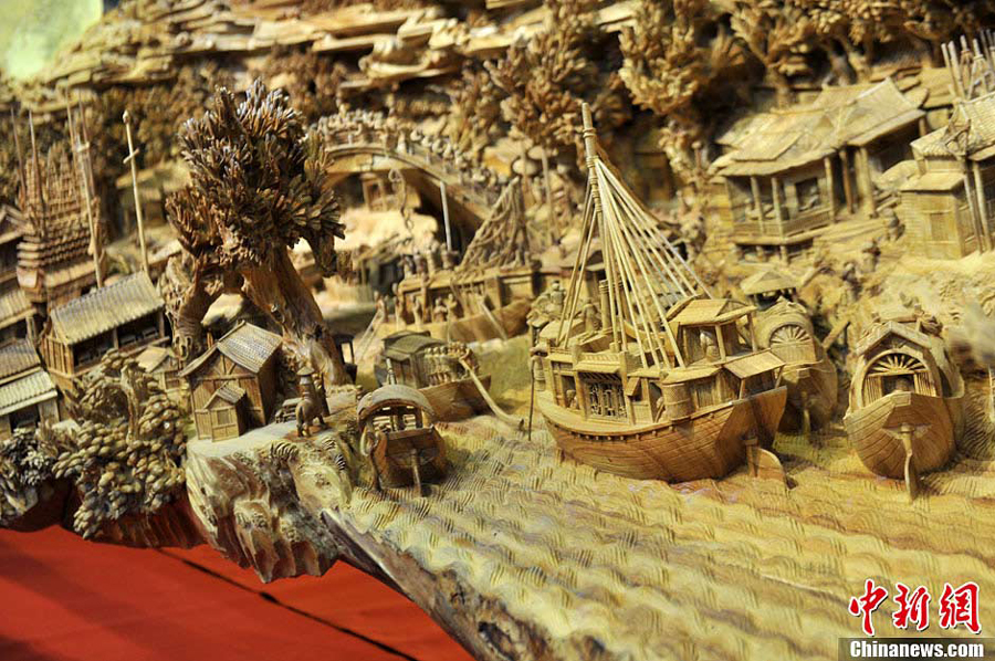 A Chinese wooden carving created by Chinese artist Zheng Chunhui featuring the famous historical painting “Along the River During the Qingming Festival” was named the longest wooden carving in the world by Guinness World Book of Records on Nov. 14, 2013. Zheng spent four years on creating this sophisticated carving, which is 12.286 meters long, 3.075 meters high and 2.401 meters wide.(CNS/Lyu MIng)