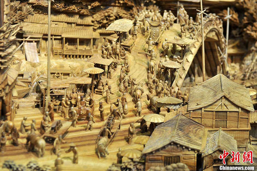 A Chinese wooden carving created by Chinese artist Zheng Chunhui featuring the famous historical painting “Along the River During the Qingming Festival” was named the longest wooden carving in the world by Guinness World Book of Records on Nov. 14, 2013. Zheng spent four years on creating this sophisticated carving, which is 12.286 meters long, 3.075 meters high and 2.401 meters wide.(CNS/Lyu MIng)
