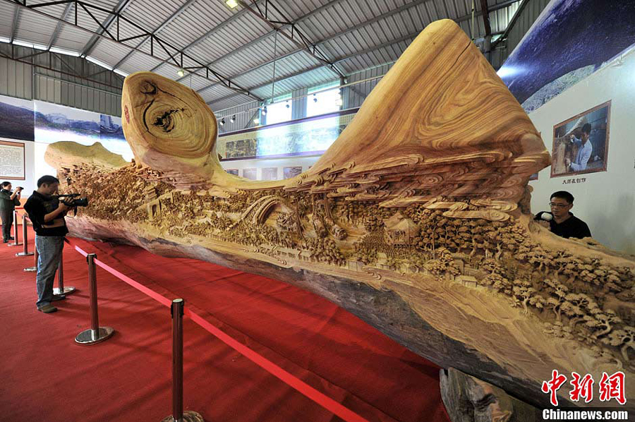 A Chinese wooden carving created by Chinese artist Zheng Chunhui featuring the famous historical painting “Along the River During the Qingming Festival” was named the longest wooden carving in the world by Guinness World Book of Records on Nov. 14, 2013. Zheng spent four years on creating this sophisticated carving, which is 12.286 meters long, 3.075 meters high and 2.401 meters wide.(CNS/Lyu MIng)