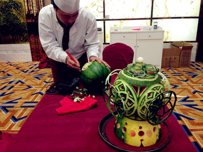 A chef carves a watermelon lamp. (chinadaily.com.cn/Yu Yao)