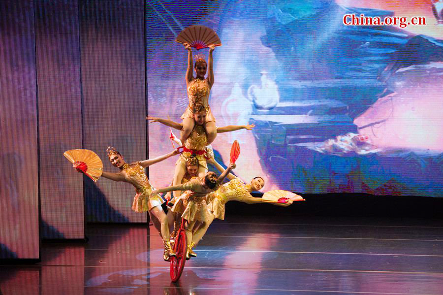 China National Acrobatic Troup gives a New Year performance to foreign diplomats and state-employed foreign experts and expats working in Beijing on Thursday night, Dec. 12, 2013, in Beijing. (Photo / Chen Boyuan / China.org.cn)