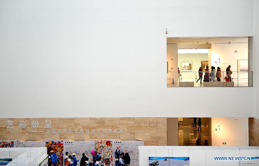 Visitors view art works displayed in an achievement exhibition of the nationwide art museum support program at the Shandong Art Museum in Jinan, capital of east China's Shandong Province, Dec. 14, 2013. Around 20 million RMB yuan (3.29 million U.S. dollars) has been spent in the support program since 2010, which benefits 53 art museums in 18 provinces. (Xinhua/Zhu Zheng)