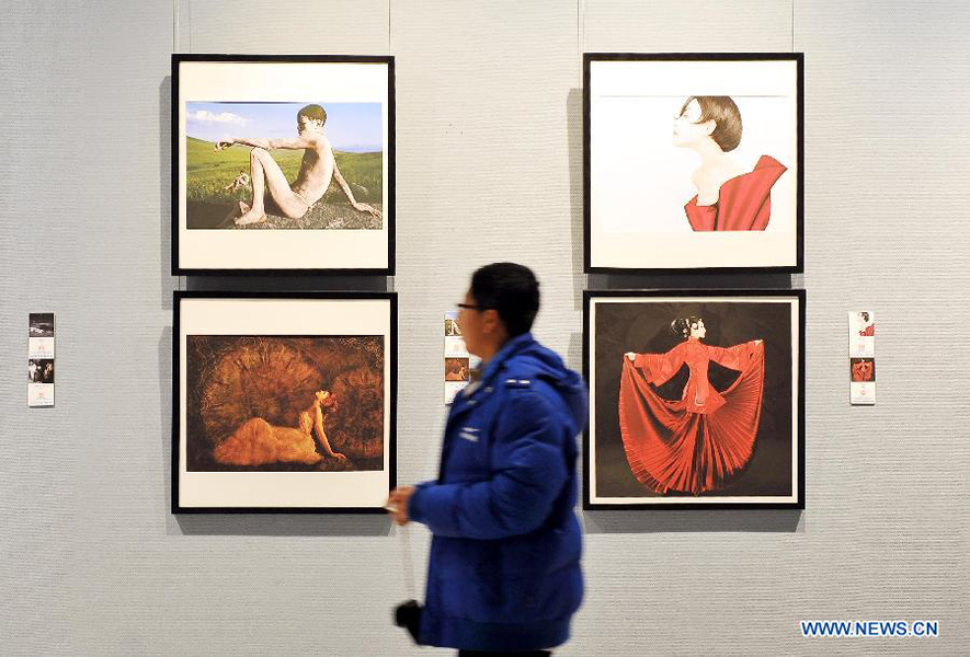 A visitor looks at an art work displayed in an achievement exhibition of the nationwide art museum support program at the Shandong Art Museum in Jinan, capital of east China's Shandong Province, Dec. 14, 2013. Around 20 million RMB yuan (3.29 million U.S. dollars) has been spent in the support program since 2010, which benefits 53 art museums in 18 provinces. (Xinhua/Zhu Zheng)
