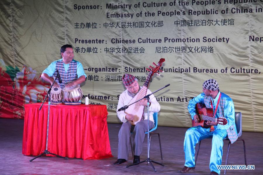 Chinese and Nepalese musicians perform during the opening performance at the Sixth China Festival at the Nepal National Academy hall in Kathmandu, capital of Nepal, Dec. 13, 2013. The China Festival in Nepal was initiated in 2003 and has been held once in every two years. It will go on for seven days this year and is aimed at bridging the cultural gap between the two countries. (Xinhua/Tang Wei)