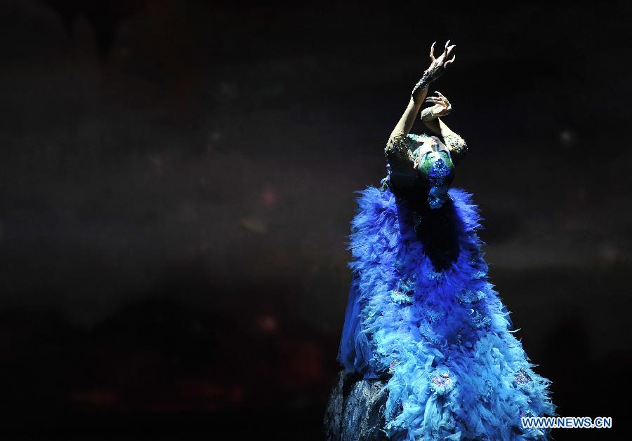 Chinese dancing master Yang Liping performs in her dance drama "The Peacock" during the first Yang Liping International Dance Festival in Kunming, capital of southwest China's Yunnan Province, Dec. 19, 2013. The 20-day festival will end on Dec. 25. (Xinhua/Qin Lang)
