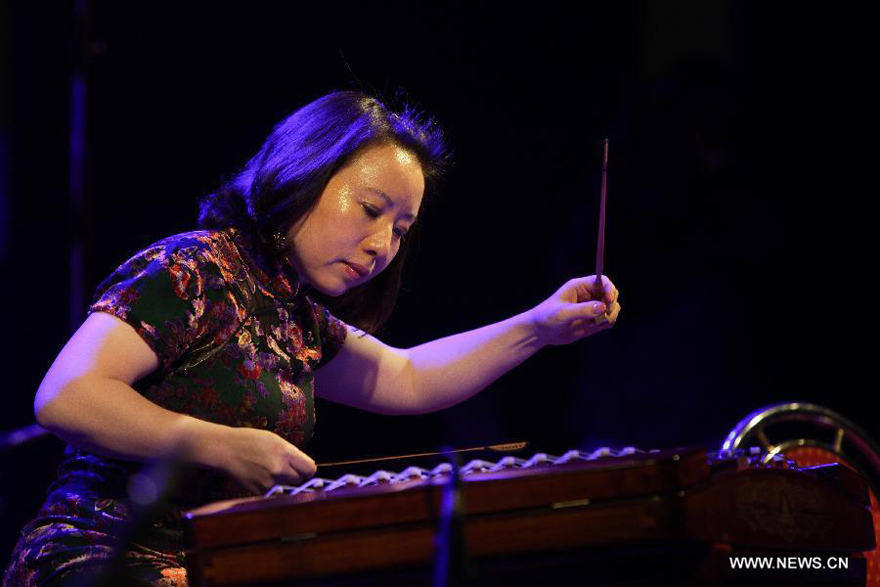 Liu Yuening, professor from China's Central Conservatory of Music, performs at a musical concert in Nagpur of Maharashtra in India, Dec. 21, 2013. An India-China music concert and a Chinese music workshop were held in central India's city of Nagpur on Saturday and Sunday. Chinese musicians and their traditional Chinese music attracted many spectators. [Xinhua/Zheng Huansong]