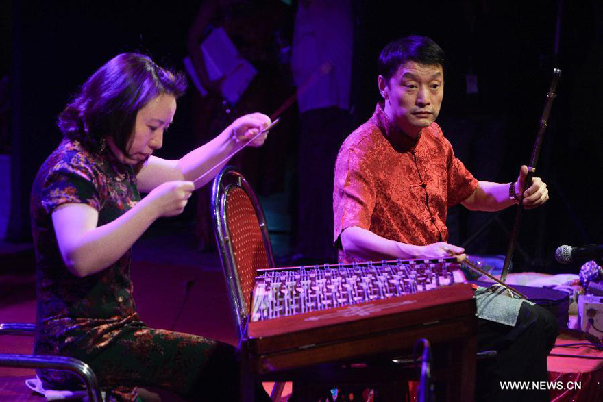 Liu Yuening (L), professor from China's Central Conservatory of Music, and Ji Jie, musician from China Oriental Performing Arts Group, perform at a musical concert in Nagpur of Maharashtra in India, Dec. 21, 2013. An India-China music concert and a Chinese music workshop were held in central India's city of Nagpur on Saturday and Sunday. Chinese musicians and their traditional Chinese music attracted many spectators. [Xinhua/Zheng Huansong]