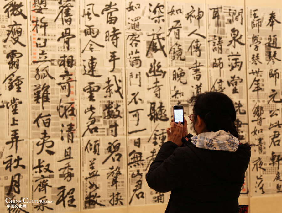 Huang Jun calligraphy exhibition opened at the National Art Museum of China on December 29, 2013. The exhibition consists of three parts, showcasing 120 of Huang Jun’s top works all created within a decade which showcase five writing styles: seal character, official script, regular script, running script and cursive hand. The exhibition will run through January 10. [Photo by Liu Fang]
