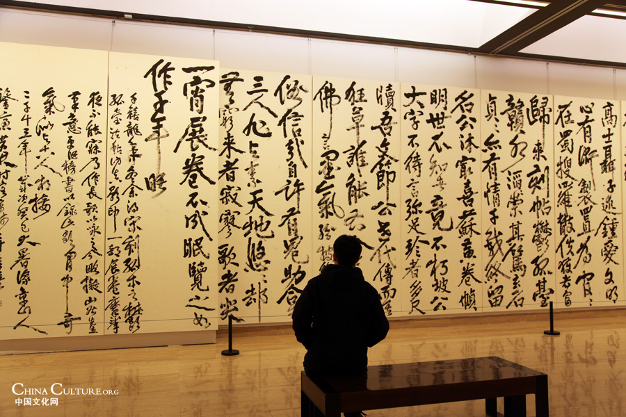Huang Jun calligraphy exhibition opened at the National Art Museum of China on December 29, 2013. The exhibition consists of three parts, showcasing 120 of Huang Jun’s top works all created within a decade which showcase five writing styles: seal character, official script, regular script, running script and cursive hand. The exhibition will run through January 10. [Photo by Liu Fang]