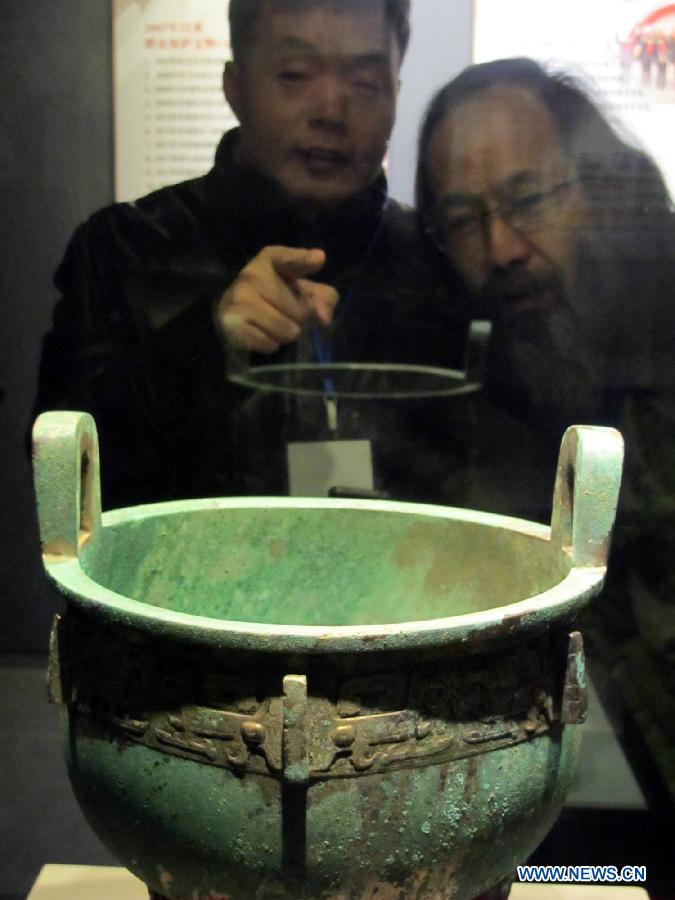 Photo taken on Dec. 29, 2013 shows a bronze vessel at an exhibition showcasing bronze ware unearthed by archaeological digs last year, in the Baoji Bronze Ware Museum in Baoji, northwest China's Shaanxi province. The artifacts exhibited here were retrieved from three tombs from the West Zhou Dynasty (1046 BC - 771 BC) in Shigushan Mountain of Baoji City. [Xinhua/Feng Guo]