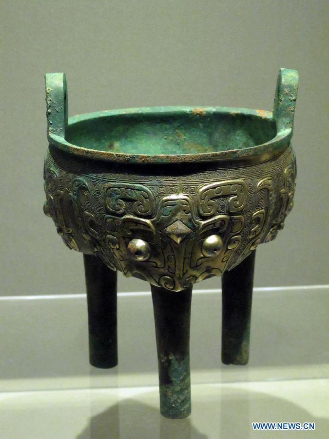 Photo taken on Dec. 29, 2013 shows a bronze vessel at an exhibition showcasing bronze ware unearthed by archaeological digs last year, in the Baoji Bronze Ware Museum in Baoji, northwest China's Shaanxi province. The artifacts exhibited here were retrieved from three tombs from the West Zhou Dynasty (1046 BC - 771 BC) in Shigushan Mountain of Baoji City. [Xinhua/Feng Guo]