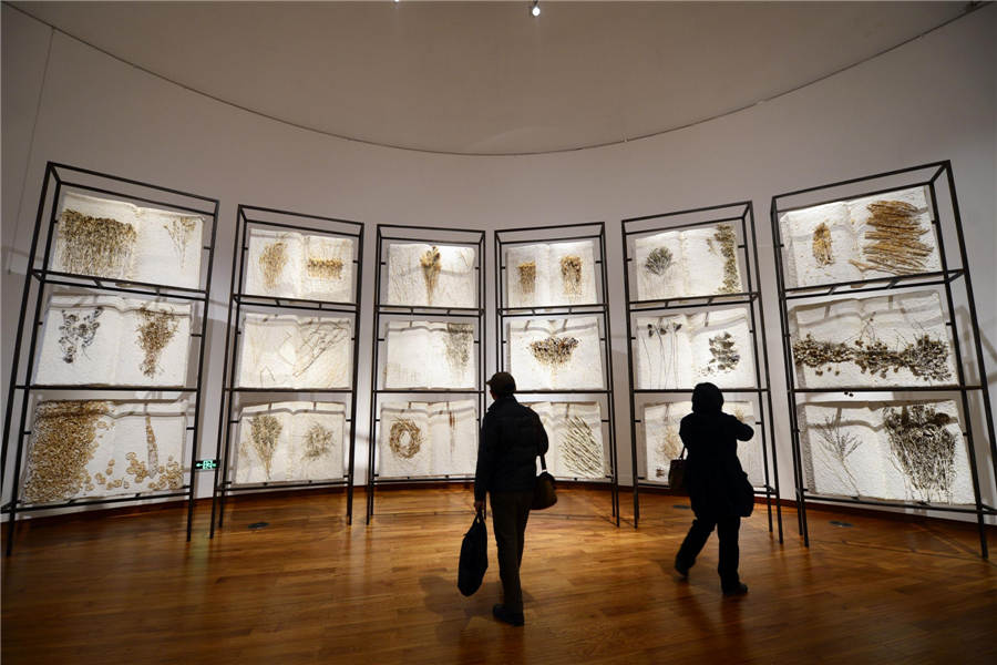 Visitors enjoy the sculptures by Shi Hui at the latest art exhibition held at the China Academy of Art in Hangzhou, Zhejiang province, December 30, 2013. The exhibition, which celebrates the 85th anniversary of the founding of the academy's sculpture department, will run for 10 days. [Photo/Xinhua]
