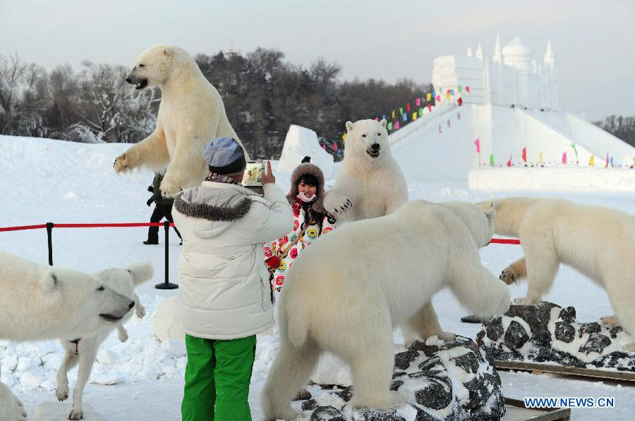 A woman poses for a photo with stuffed polar bears displayed at the International Snow Sculpture Expo in Harbin, capital of northeast China's Heilongjiang Province, Jan. 6, 2014. (Xinhua/Wang Song)