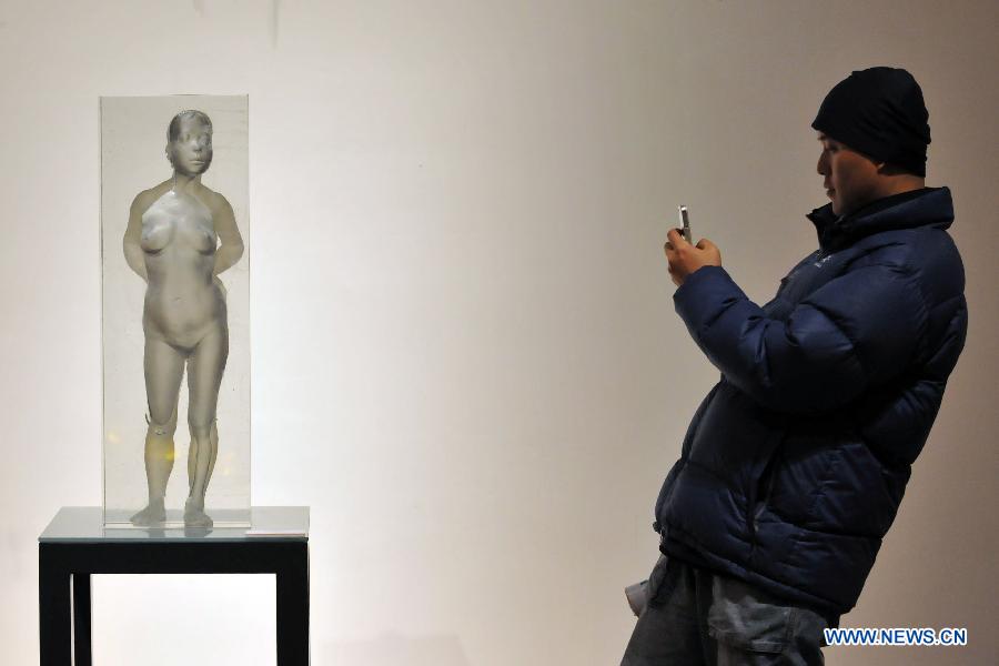 A visitor takes a photo of a glass art creation at China Academy of Art in Hangzhou, capital of east China's Zhejiang Province, Jan. 13, 2014. Around 100 glass art creations were exhibited here on Monday. (Xinhua/Long Wei)