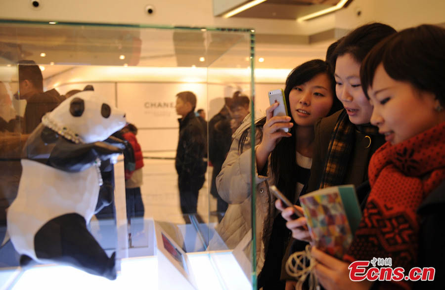 A charity exhibition, featuring stylish panda sculptures, is held at Chengdu IFS in southwest China's Sichuan province on Jan. 14, 2014. The 20 panda sculptures, designed by 20 celebrities and fashion leaders, will be auctioned to raise money for a giant panda disease and control center in Dujiangyan. [Photo: China News Service / Liu Zhongjun]