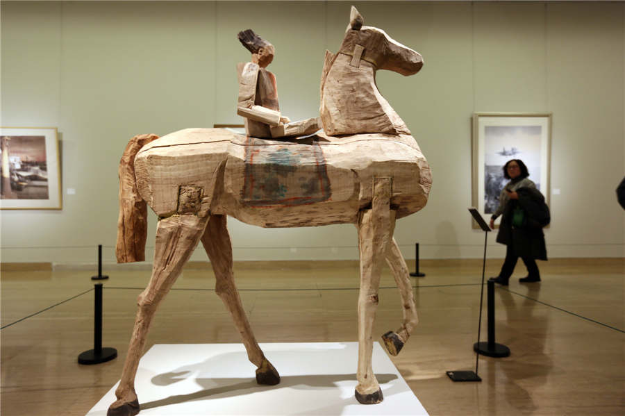 A visitor enjoys a sculpture at the National Art Museum of China in Beijing, January 16, 2014. [Photo by Lei Kesi/Asianewsphoto]