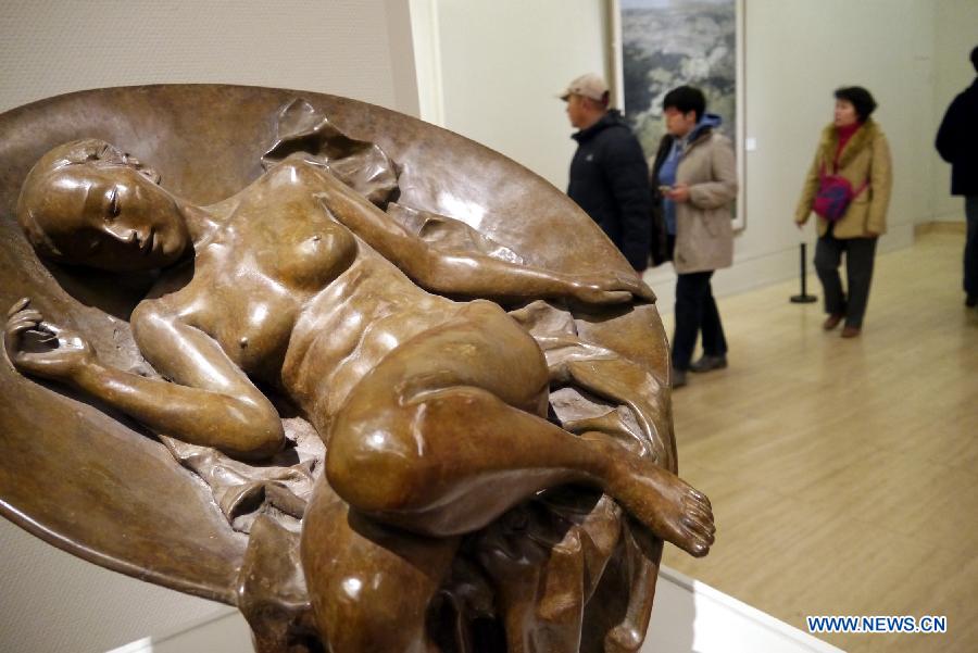 People walk past a sculpture displayed at a Spring Festival, or the Chinese Lunar New Year celebration exhibition in the National Art Museum of China in Beijing, capital of China, Feb. 1, 2014. The works on show include traditional Chinese painting, oil painting, sculpture and watercolor. The exhibition will last until Feb. 16. [Xinhua/Li Mingfang]