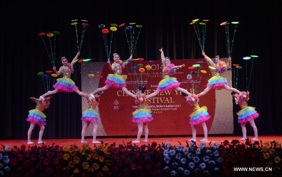 Chinese acrobats perform in celebration of the Year of China-India Friendly Exchanges in New Delhi, India, Feb. 13, 2014. (Xinhua/Partha Sarkar)