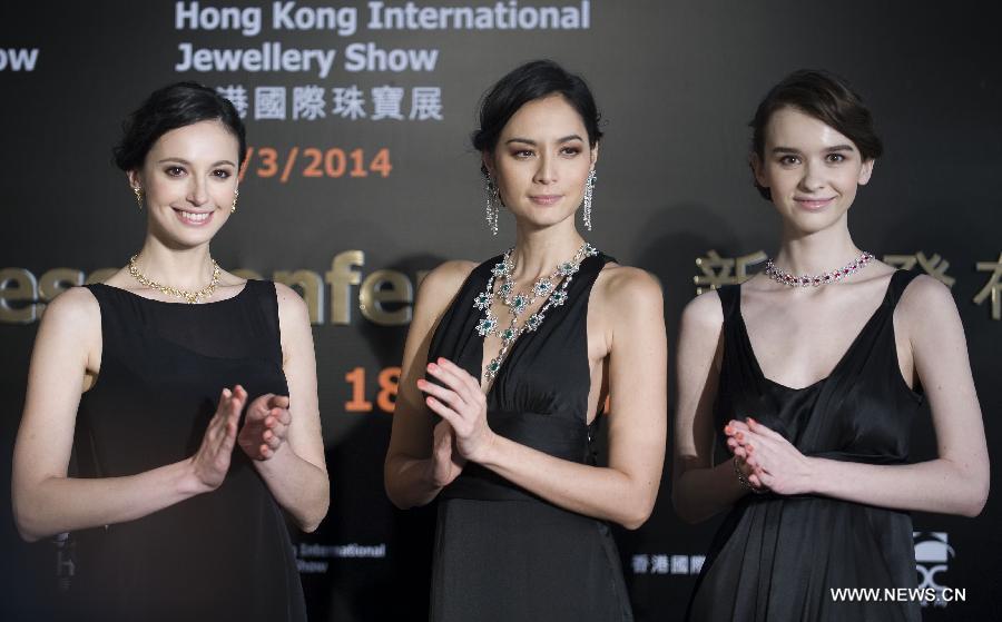 Models display jewelries during a press conference of the 31st Hong Kong International Jewellery Show in Hong Kong, south China, Feb. 18, 2014. The show will run from March 5 to 9 at Hong Kong Convention Exhibition Center. (Xinhua/Zhao Yusi)